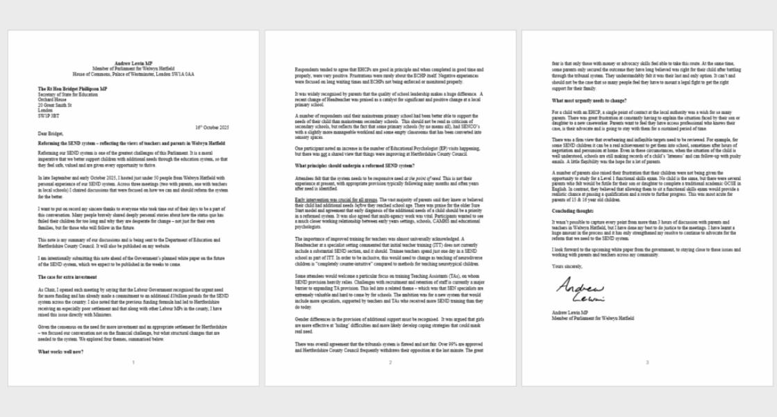 Andrew Lewin MP writes to Bridget Phillipson regarding SEND reform in Welwyn Hatfield